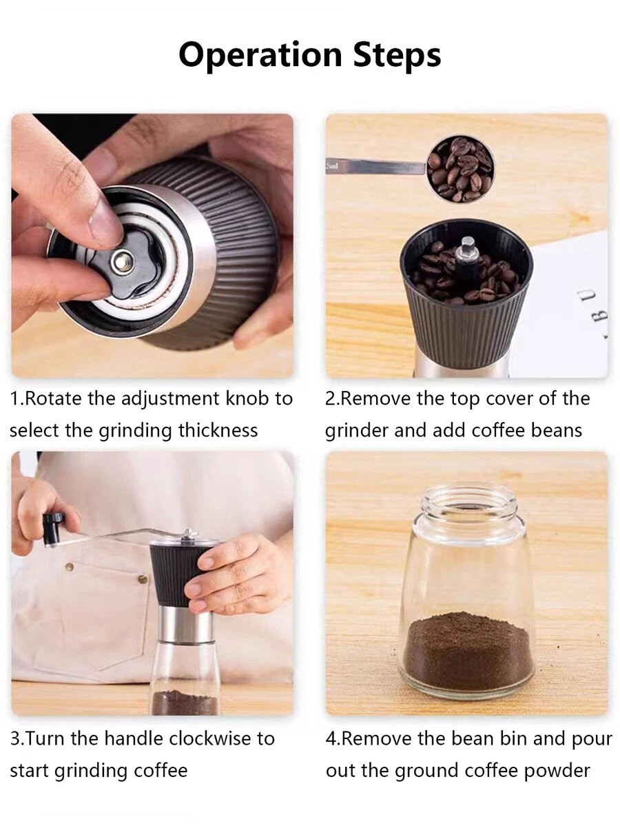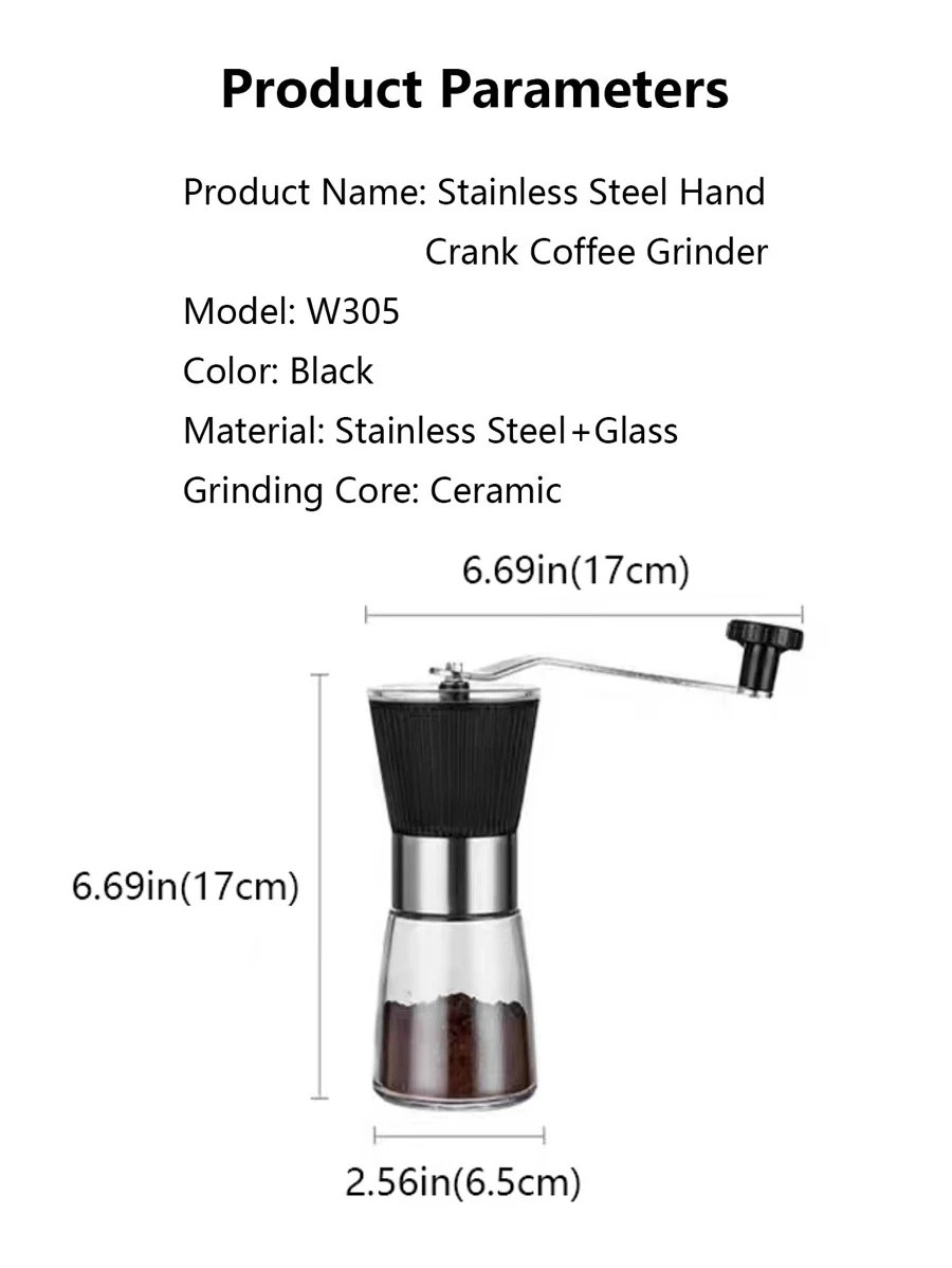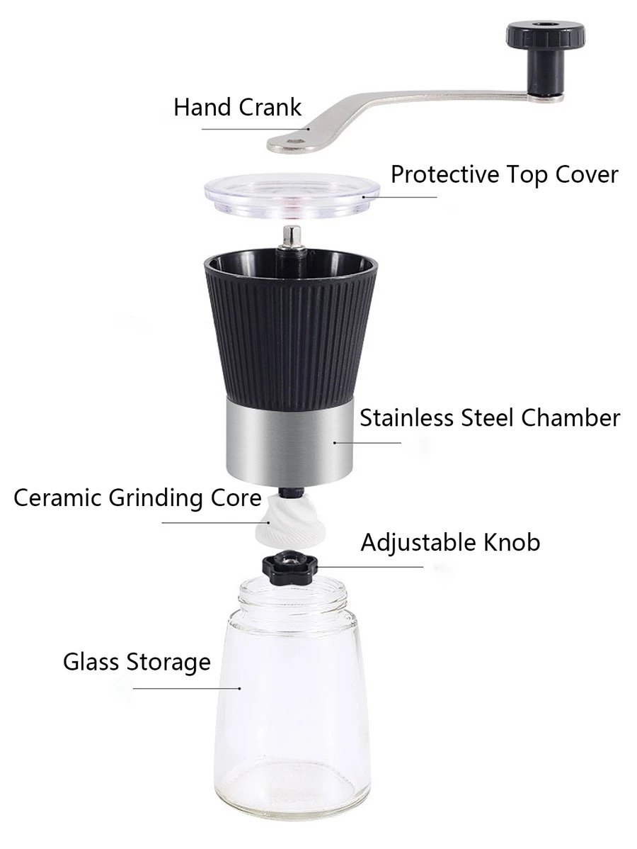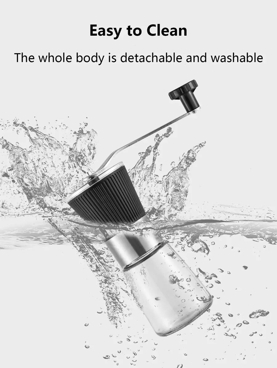 مطحنة يدوية للقهوة مصنوعة من الفولاذ المقاوم للصدأ الذي يضمن صلابة عالية ومقاومة للصدأ والتآكل، مما يجعلها أداة تدوم طويلاً حتى مع الاستخدام اليومي. أما الجزء السفلي المصنوع من الزجاج الشفاف فيمنح المستخدم رؤية واضحة لمستوى البن المطحون داخل الوعاء، مما يساعد على التحكم في الكمية بدقة دون الحاجة إلى فتح الغطاء بشكل متكرر