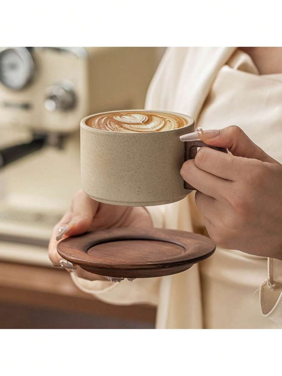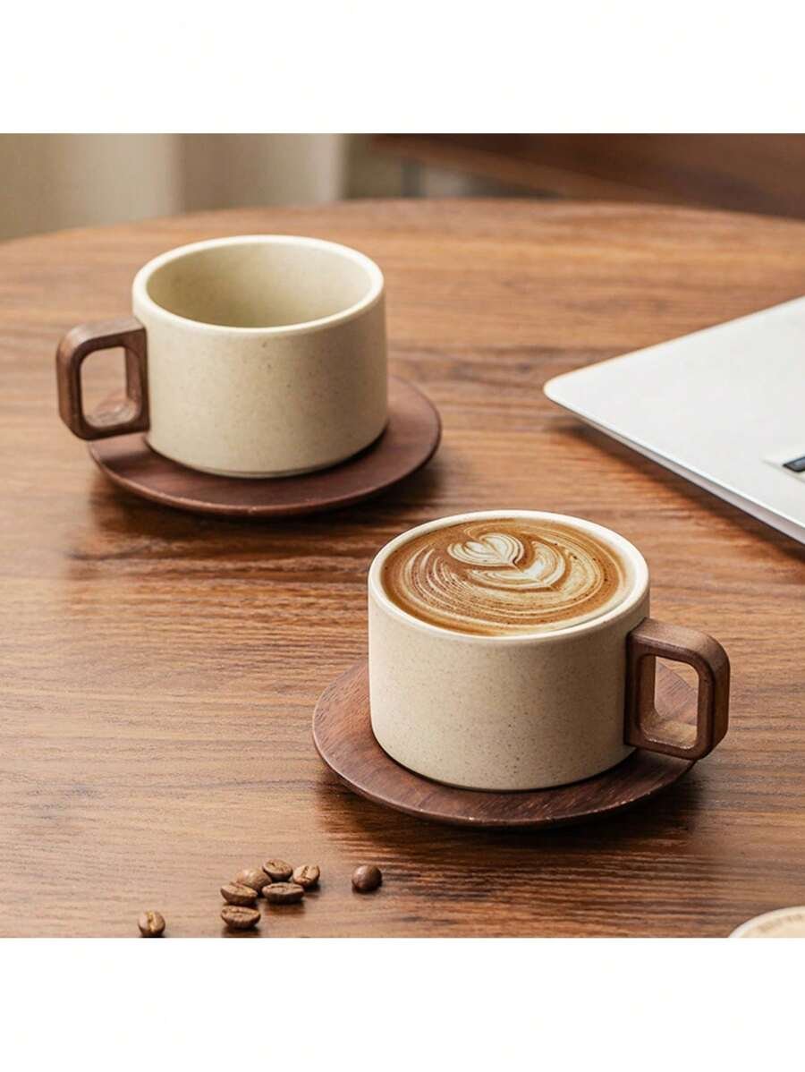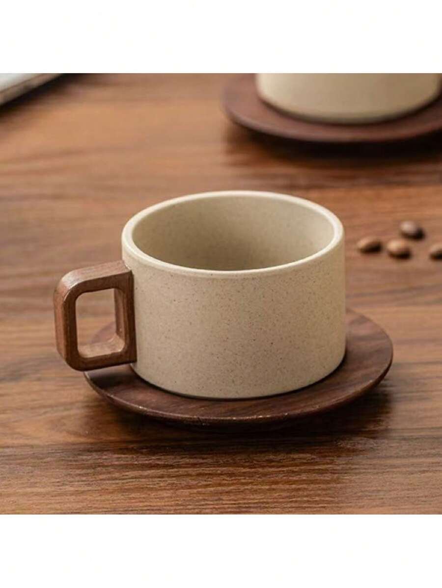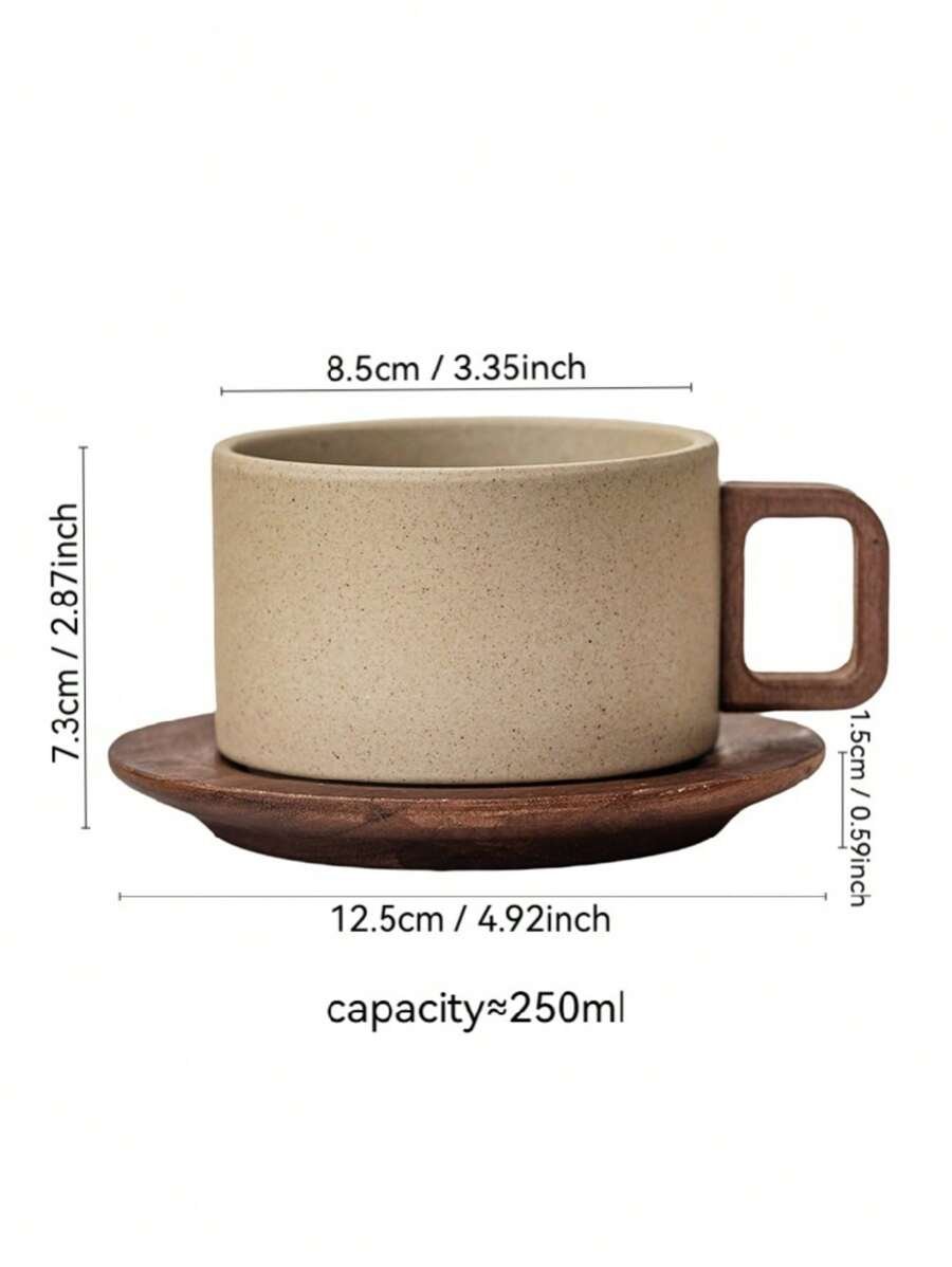 طقم فنجان قهوة من الفخار سعة 250 مل + طقم فنجان وصحن خشبي |