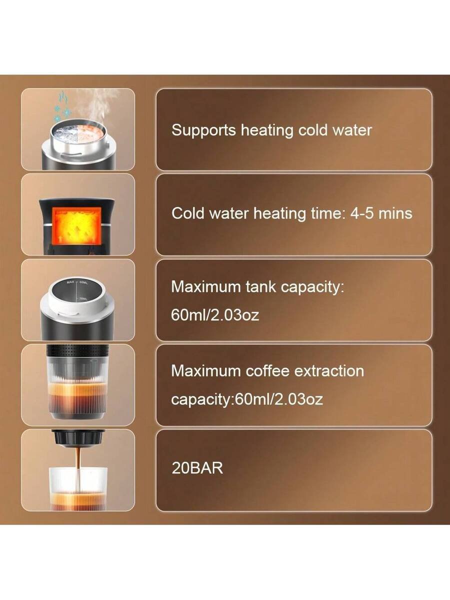 استمتعوا بتجربة قهوة لا مثيل لها مع ماكينة قهوة محمولة ، حيث يتميز بقدرته على تسخين الماء البارد بسرعة تتراوح بين 4 إلى 5 دقائق، ما يتيح لك الحصول على كوب قهوة ساخن خلال وقت قصير، دون الحاجة إلى معدات كبيرة أو مصدر طاقة ثابت